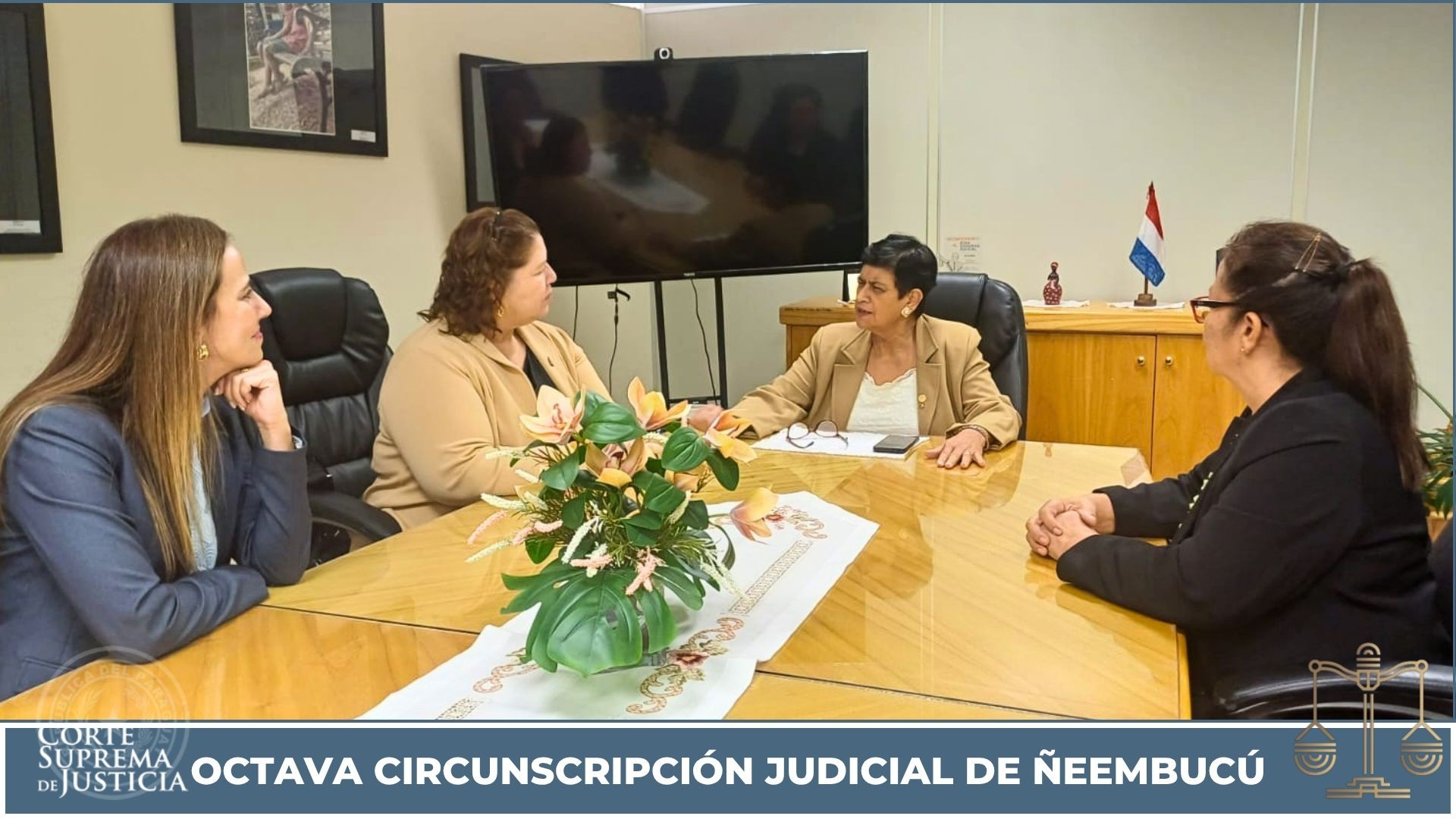 Previo a la actividad, las integrantes del Consejo de Administración de Ñeembucú, presidido por la magistrada Rosa Isabel Dejesús Quiñónez, junto a las vicepresidentas magistradas Adelaida Servián Vega y Claudia F. Alonso, mantuvieron una reunión protocolar con la presidenta del Consejo de Administración de Guairá, abogada Elsa Escobar de Keudell, en un espacio de intercambio institucional.