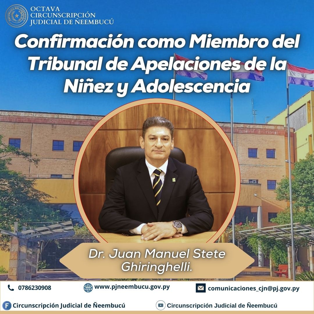 La Circunscripción Judicial de Ñeembucú expresa sus felicitaciones al Dr. Juan Manuel Stete Ghiringhelli, quien en la sesión plenaria de la Corte Suprema de Justicia, realizada el 4 de marzo, fue confirmado por unanimidad como miembro del Tribunal de Apelaciones...